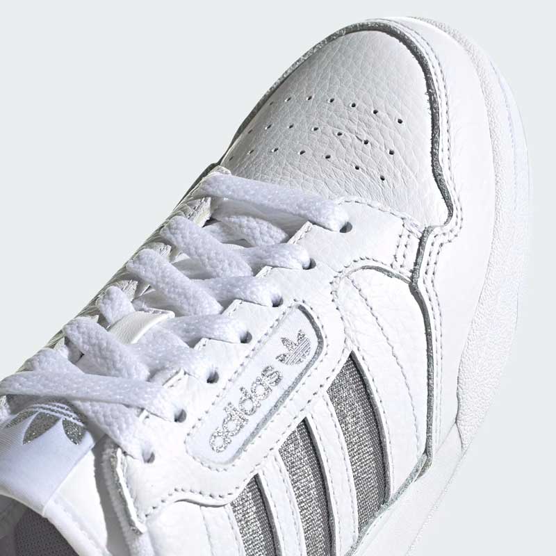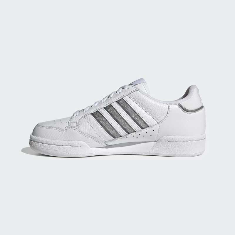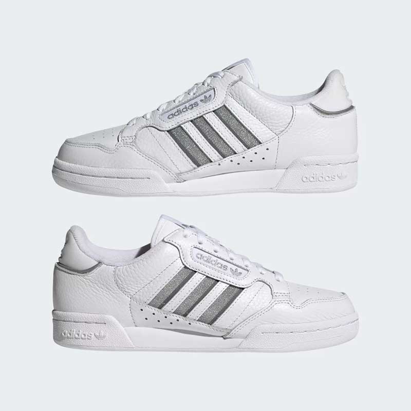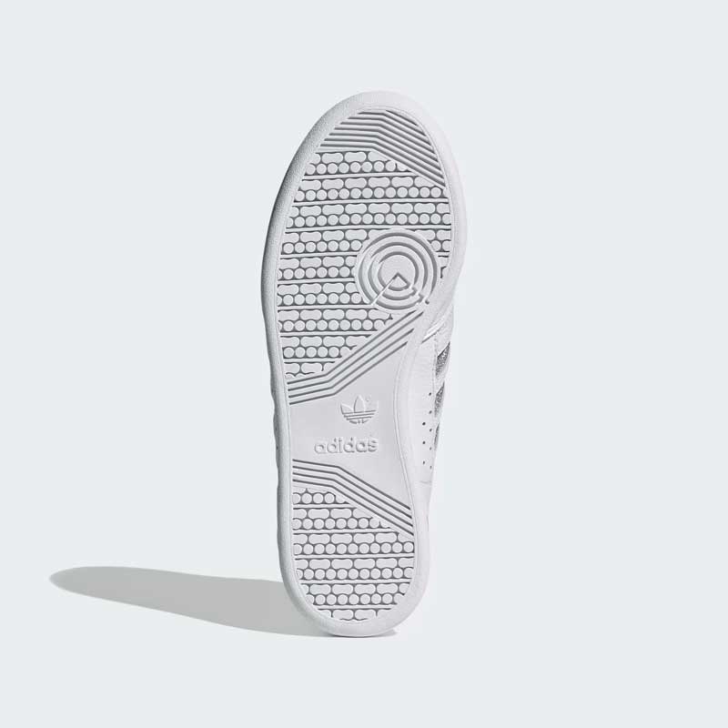 کتانی آدیداس Continental 80 Stripes مدل S42626 با طراحی کلاسیک دهه ۸۰، رویه چرمی سفید با نوارهای نقرهای و زیره راحت EVA — مناسب استفاده روزمره و استایلیز. بهترین انتخاب برای استایل لوکس و راحت.